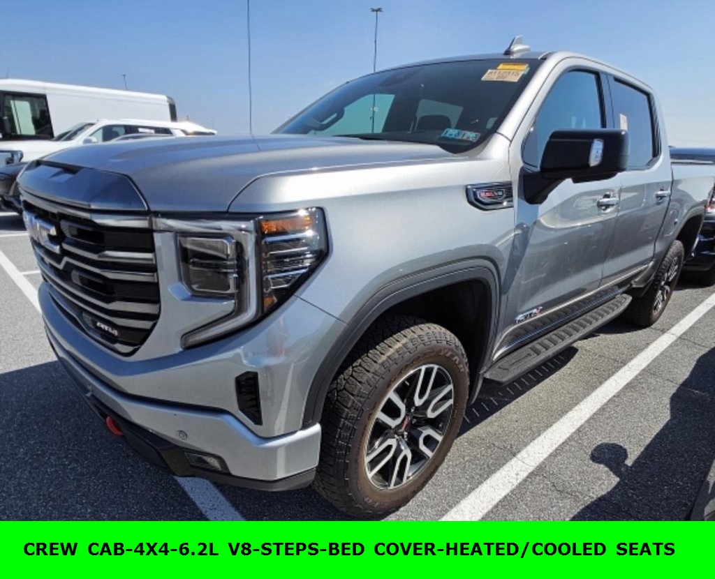 One Owner, Clean Autocheck / No Accidents, Remaining Factory Warranty, Extended Warranty Available, Bluetooth® / Hands-free, Apple Car Play / Android Auto Compatible, Back-Up Camera w/ Guidelines, Heated Seats, Keyless Entry, Leather Seats, Multi-Zone Climate Control, Navigation, Portable Audio Connection, Premium Audio, Premium Wheels, Security System, Multi-function Steering Wheel, Trailer Hitch, 4×4/4WD, Remote Start, Spray-in Bedliner, Apple Carplay, Android Auto, Cooled Seats, Oversized Tires, iphone / Droid Navigation Compatible, Bed COVER, Sierra 1500 AT4, 4D Crew Cab, EcoTec3 6.2L V8, 10-Speed Automatic, 4WD, Sterling Metallic, Jet Black w/Kalahari Accents w/Perforated Front Leather Seat Trim, 120-Volt Interior Power Outlet, 2 Charge/Data USB Ports Inside Center Console, 2 Type-C Charge-Only Rear USB Ports, 2 USB Ports, 220 Amp Alternator, AT4 Preferred Package, AT4 Premium Package, Auto-Locking Rear Differential, Black Chrome Header & Grille Insert Bars, Color-Keyed Carpeting Floor Covering, Deep-Tinted Glass, Electric Rear-Window Defogger, Floor-Mounted Center Console, Front Prem Floor Liners w/Removable Carpet Insert, Front Rain-Sensing Wipers, GMC Connected Access Capable, HD Surround Vision, Heated 2nd Row Outboard Seats, Heated Driver & Front Outboard Passenger Seating, Heavy-Duty Air Filter, Hill Descent Control, Hitch View, In-Vehicle Trailering System App, Integrated Trailer Brake Controller, Keyless Open & Start, LED Cargo Area Lighting, Navigation System, Off-Road High Clearance Step (LPO), OnStar & GMC Connected Services Capable, Perimeter Lighting, Power Front Passenger Windows w/Express Up/Down, Power Front Windows w/Driver Express Up/Down, Power Rake & Telescoping Steering Column, Power Rear Windows w/Express Down, Power Sliding Rear Window w/Rear Defogger, Preferred Equipment Group 4SB, Premium Bose 7-Speaker Sound System, Push Button Start, Rear Cross Traffic Braking, Rear Pedestrian Detection, Rear Wheelhouse Liners, Red Recovery Hooks, Remote Vehicle Starter System, SiriusXM w/360L, Spray-On Pickup Bedliner w/AT4 Logo, Steering Wheel Audio Controls, Theft Deterrent System (Unauthorized Entry), Trailer Camera Provisions, Trailer Side Blind Zone Alert, Trailering Package, Ultrasonic Front & Rear Park Assist, Universal Home Remote, Ventilated Driver & Front Passenger Seats, Wheels: 20″ x 9″ Machined Aluminum, Wi-Fi Hotspot Capable, Wireless Charging.